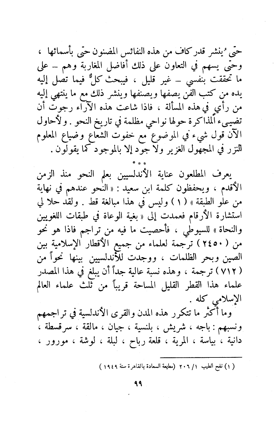 حتى يُنشر قدر كافٍ من هذه النفائس المضنون حتى بأسمائها، وحتى يسهم في التعاون على ذلك أفاضل المغاربة وهم -على ما تحققت بنفسي- غير قليل، فيبحث كل فيما تصل إليه يده من كتب الفن, يصفها ويصنفها وينشر ذلك مع ما ينتهي إليه من رأي في هذه المسألة، فإذا شاعت هذه الآراء رجوت أن تضيء المذاكرة حولها نواحي مظلمة في تاريخ النحو. ولأحاول الآن قول شيء في الموضوع مع خفوت الشعاع وضياع المعلوم النزر في المجهول الغزير, ولا جود إلا بالموجود كما يقولون.