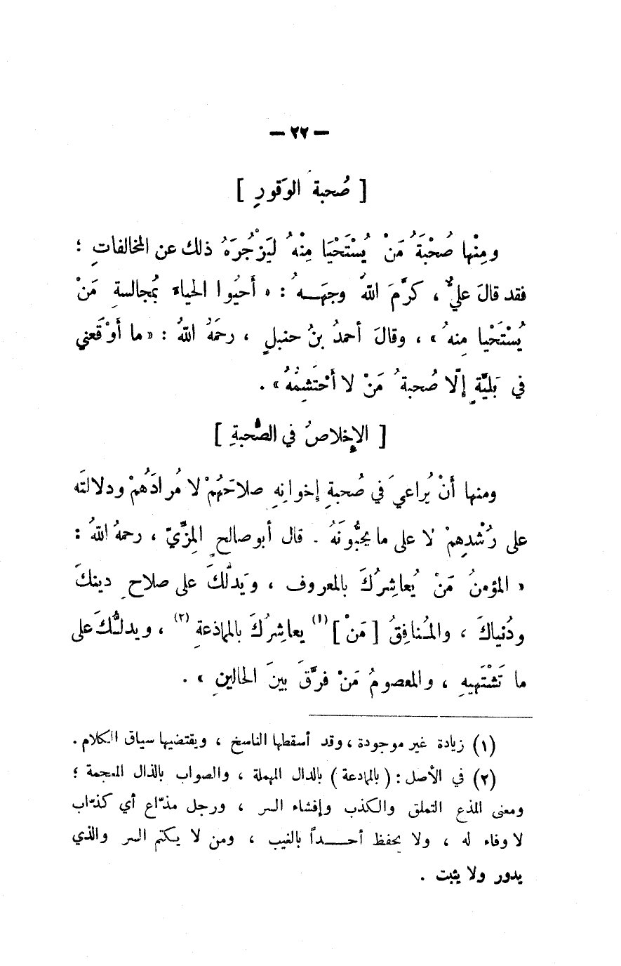 ومنها صحبة من يستحيا منه ليزجره ذلك عن المخالفات؛ فقال قال عليٌّ كرم الله وجهه: (أحيوا الحياء بمجالسة من يستحيا منه) . وقال أحمد بن حنبل رحمه الله: (ما أوقعني في بلية إلا صحبة من لا أحتشمه) .