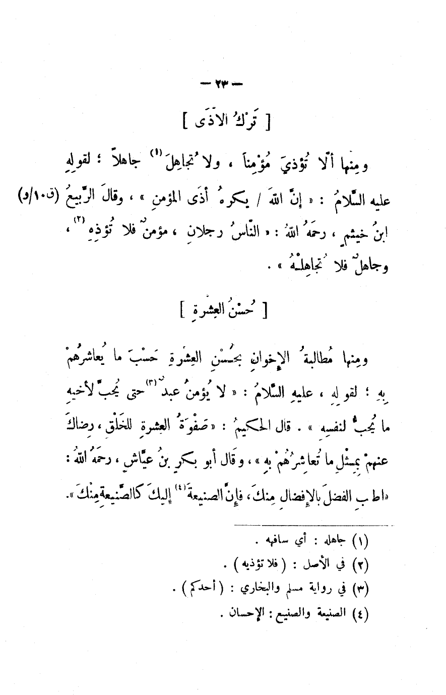ومنها ألا تؤذي مؤمناً، ولا تجاهل جاهلاً؛ لقوله عليه السلام: (إن الله يكره أذى المؤمن) . وقال الربيع ابن خيثم رحمه الله: (الناس رجلان، مؤمن فلا تؤذه، وجاهلٌ فلا تجاهله) .