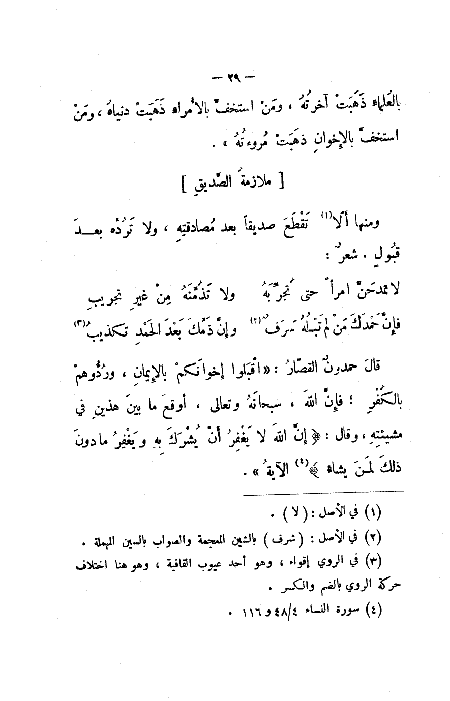 ومنها ألا تقطع صديقاً بعد مصادقته، ولا ترده بعد قبول: