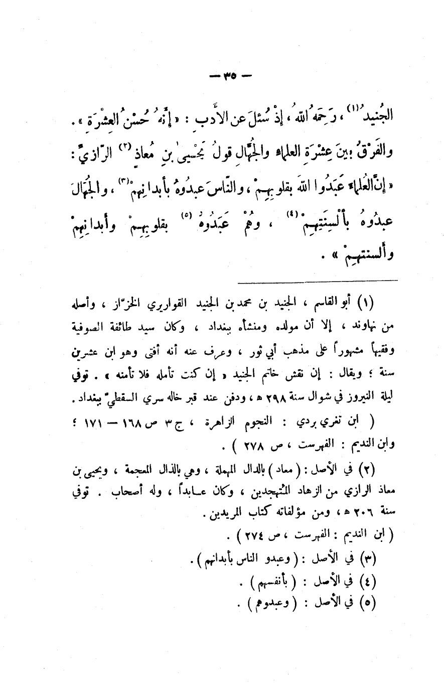الجنيد رحمه الله، إذ سُئل عن الأدب: (إنه حسن العشرة) . والفرق بين عشرة العلماء والجهال قول يحيى بن معاذ الرازي: (إن العلماء عبدوا الله بقلوبهم، والناس عبدوه بأبدانهم، والجهال عبدوه بألسنتهم، وهم عبدوه بقلوبهم وأبدانهم وألسنتهم) .