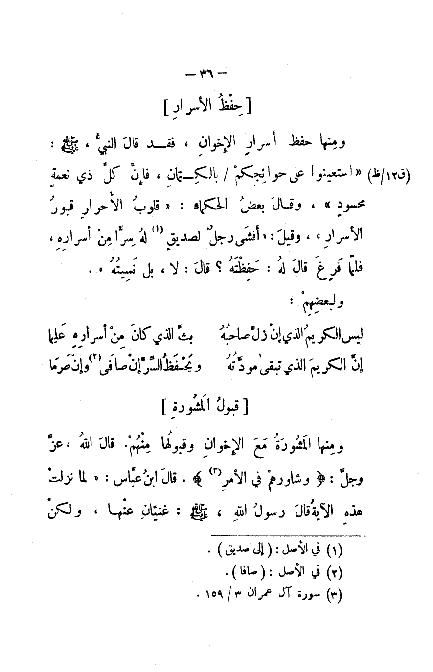 ومنها حفظ أسرار الإخوان، فقد قال النبي صلى الله عليه وسلم: (استعينوا على حوائجكم بالكتمان، فإن كل ذي نعمة محسود) . وقال بعض الحكماء: (قلوب الأحرار قبور الأسرار) . وقيل: (أفشى رجل لصديق له سرا من أسراره، فلما فرغ قال له: حفظته؟ قال: لا، بل نسيته) .