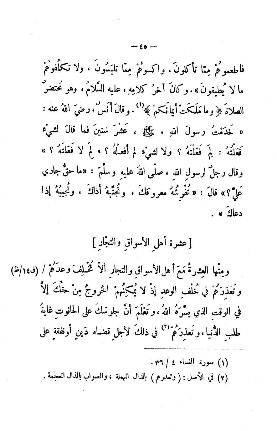 فأطمعوهم مما تأكلون، وأكسوهم مما تلبسون، ولا تكلفوهم ما لا يطيقون) . وكان آخر كلامه عليه السلام وهو محتضر: (الصلاة وما ملكت أيمانكم) . وقال أنس رضي الله عنه: (خدمت رسول الله صلى الله عليه وسلم عشر سنين فما قال لشيءٍ فعلته: لم فعلته؟ ولا لشيءٍ لم أفعله لم لا فعلته) . وقال رجل لرسول الله صلى الله عليه وسلم: (ما حق جاري عليَّ؟) قال: (تفرشه معروفك، وتجنبه أذاك، وتجيبه إذا دعاك) .