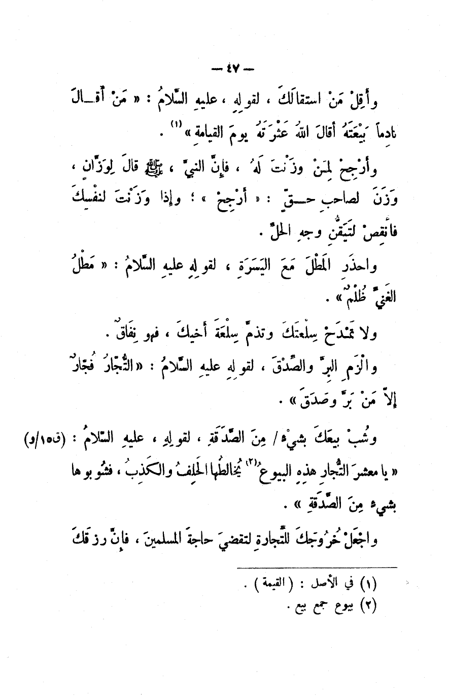 واحذر المطل مع الميسرة، لقوله عليه السلام: (مطل الغني ظلم) . ولا تمدح سلعتك وتذم سلعة أخيك، فهو نفاق.