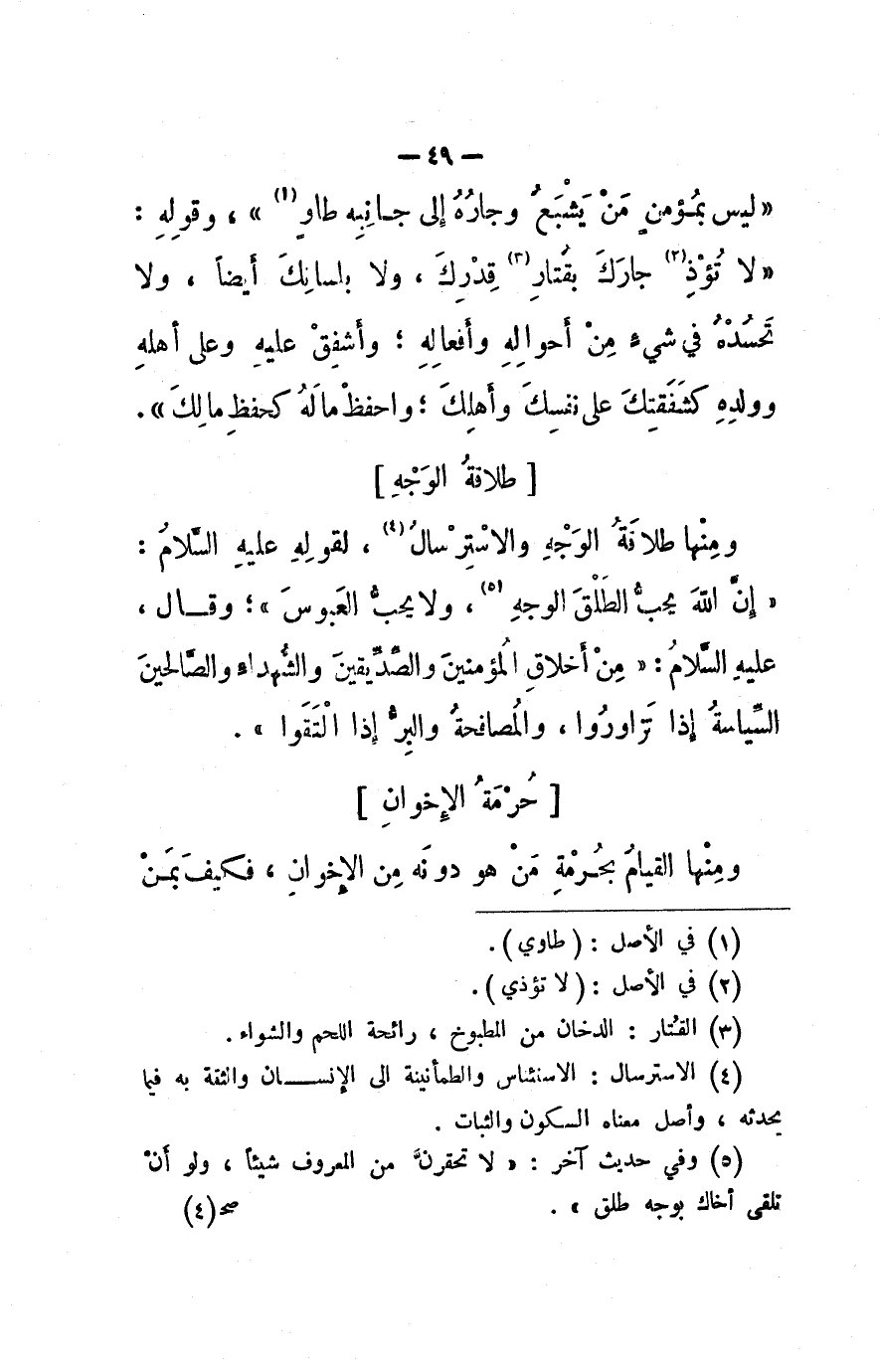 ومنها طلاقة الوجه والاسترسال، لقوله عليه السلام: (إن الله يحب الطلق الوجه، ولا يحب العبوس) . وقال عليه السلام: (من أخلاق المؤمنين والصديقين والشهداء والصالحين السياسة إذا تزاوروا، والمصافحة والبر إذا التقوا) .