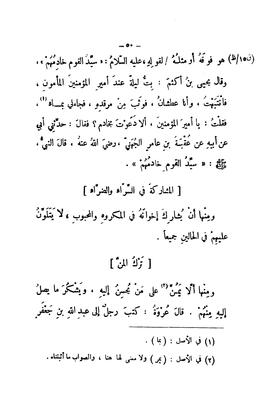 هو فوقه أو مثله، لقوله عليه السلام: (سيد القوم خادمهم) . وقال يحيى بن أكثم: بت ليلةً عند أمير المؤمنين المأمون، فانتبهت وأنا عطشان، فوثب من مرقده، فجاءني بماءٍ، فقلت: يا أمير المؤمنين، ألا دعوت بخادم؟ فقال: حدثني أبي عن أبيه عن عقبة بن عامر الجني رضي الله عنه، قال النبي صلى الله عليه وسلم: (سيد القوم خادمهم) .