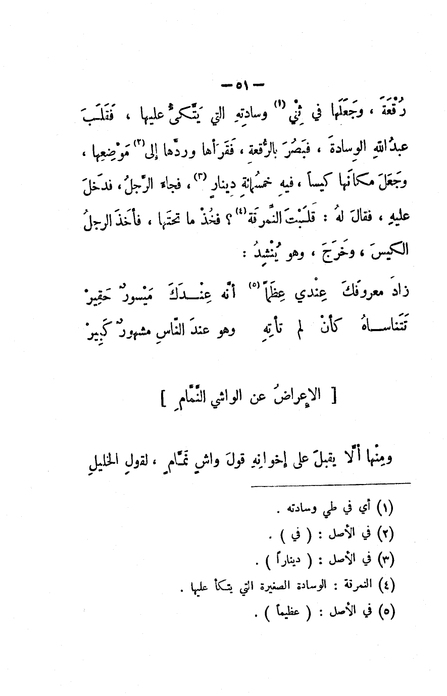 رقعة، وجعلها، في ثني وسادته التي يتكئ عليها، فقلب عبد الله الوسادة، فبصر بالرقعة، فقرأها وردها إلى موضعها، وجعل مكانها كيساً، فيه خمسمائة دينار، فجاء الرجل، فدخل عليه، فقال له: قلبت النمرقة؟ فخذ ما تحتها، فأخذ الرجل الكيس وخرج وهو ينشد: