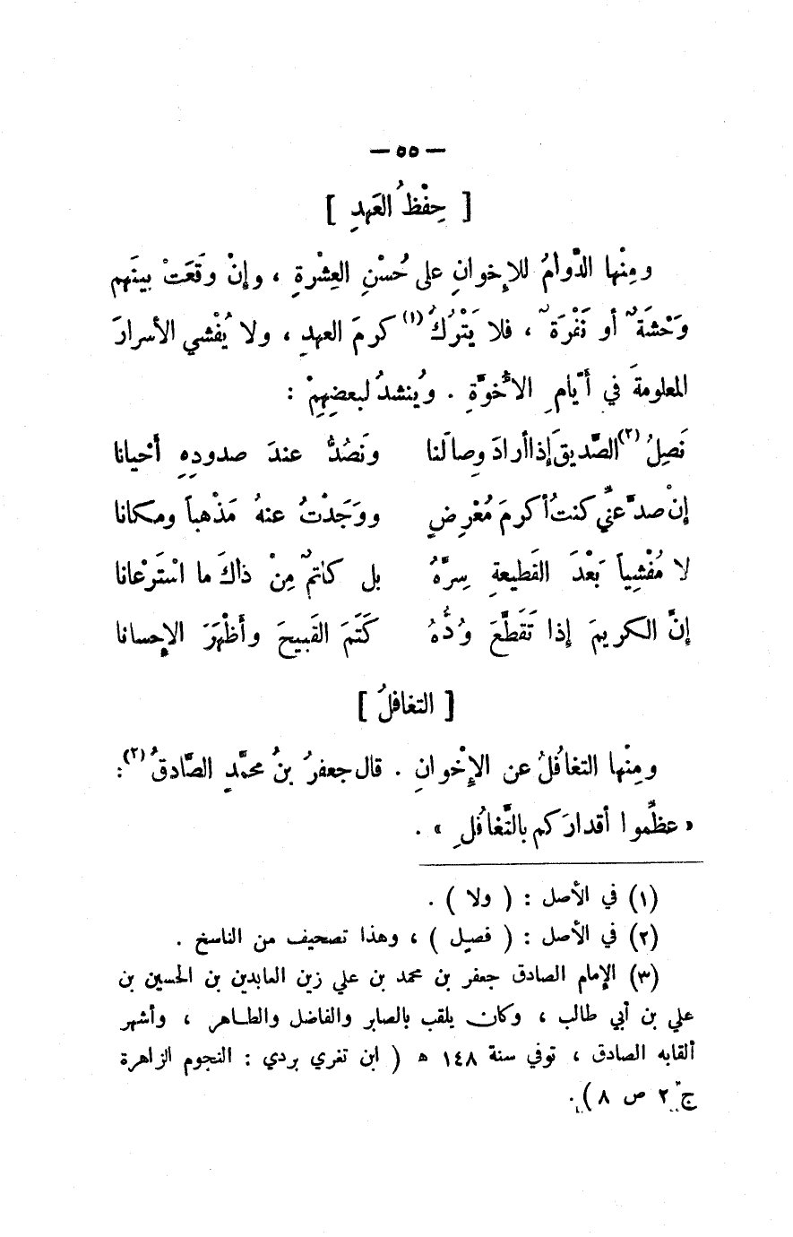 ومنها الدوام للإخوان على حسن العشرة، وإن وقعت بينهم وحشةٌ أو نفرة، فلا يترك كرم العهد، ولا يفشي الأسرار المعلومة في أيام الأخوة.
