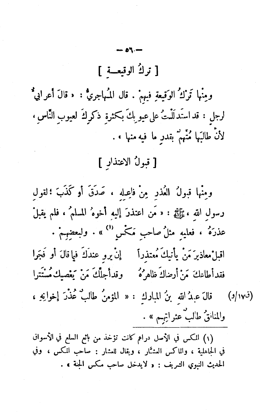 ومنها ترك الوقيعة فيهم. قال المهاجري: (قال أعرابي لرجل: قد استدللت على عيوبك بكثرة ذكرك لعيوب الناس، لأن طالبها متهم بقدر ما فيه منها) .