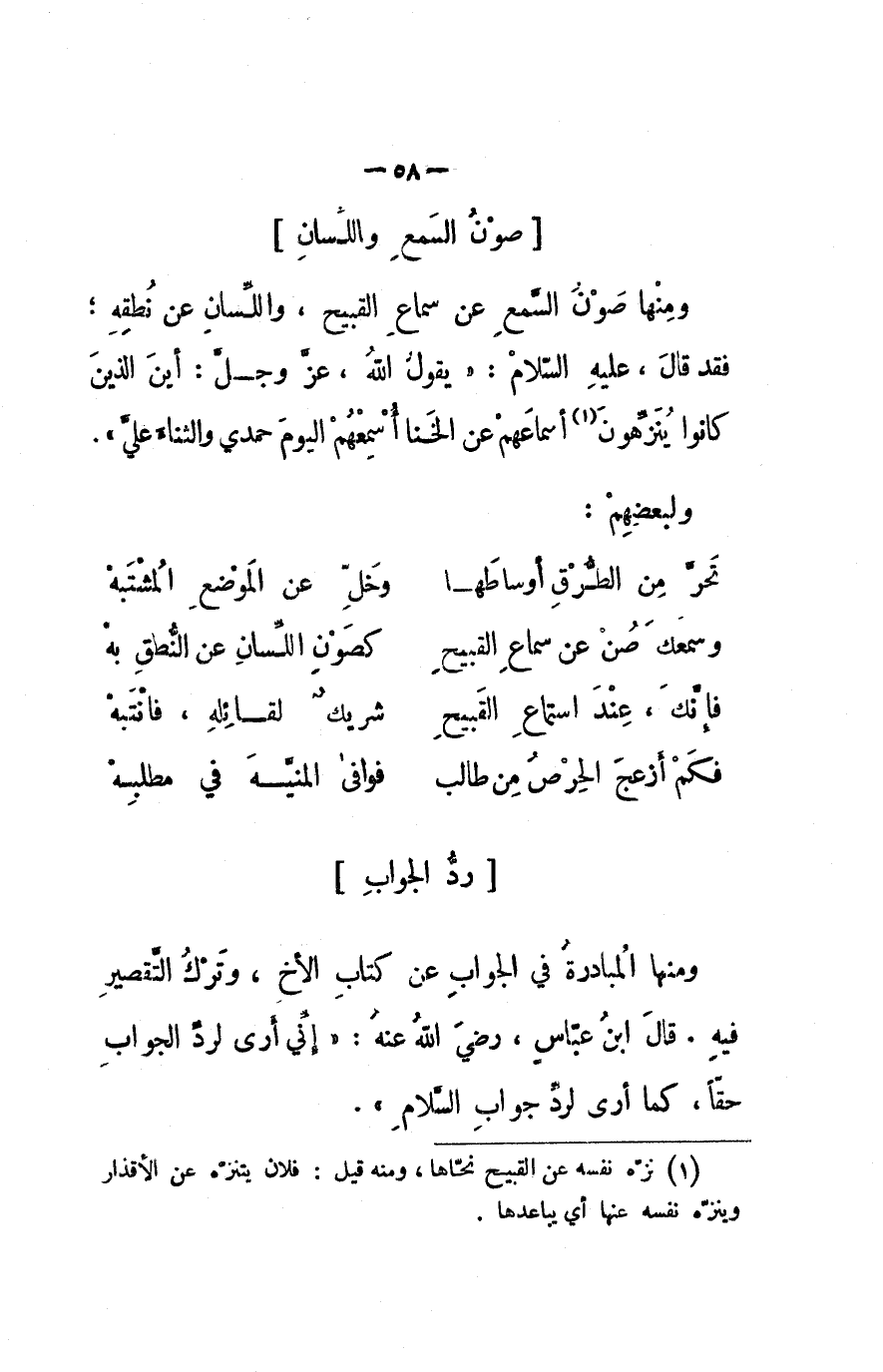 ومنها صون السمع عن سماع القبيح، واللسان عن نطقه؛ فقد قال، عليه السلام: يقول الله عز وجل: (أَينَ الَّذينَ كانوا يُنَزِّهونَ أَسماعَهُم عَن الخَنا أُسمِعهُم اليَومَ حَمدي وَالثَناءَ عَلَيَّ) .