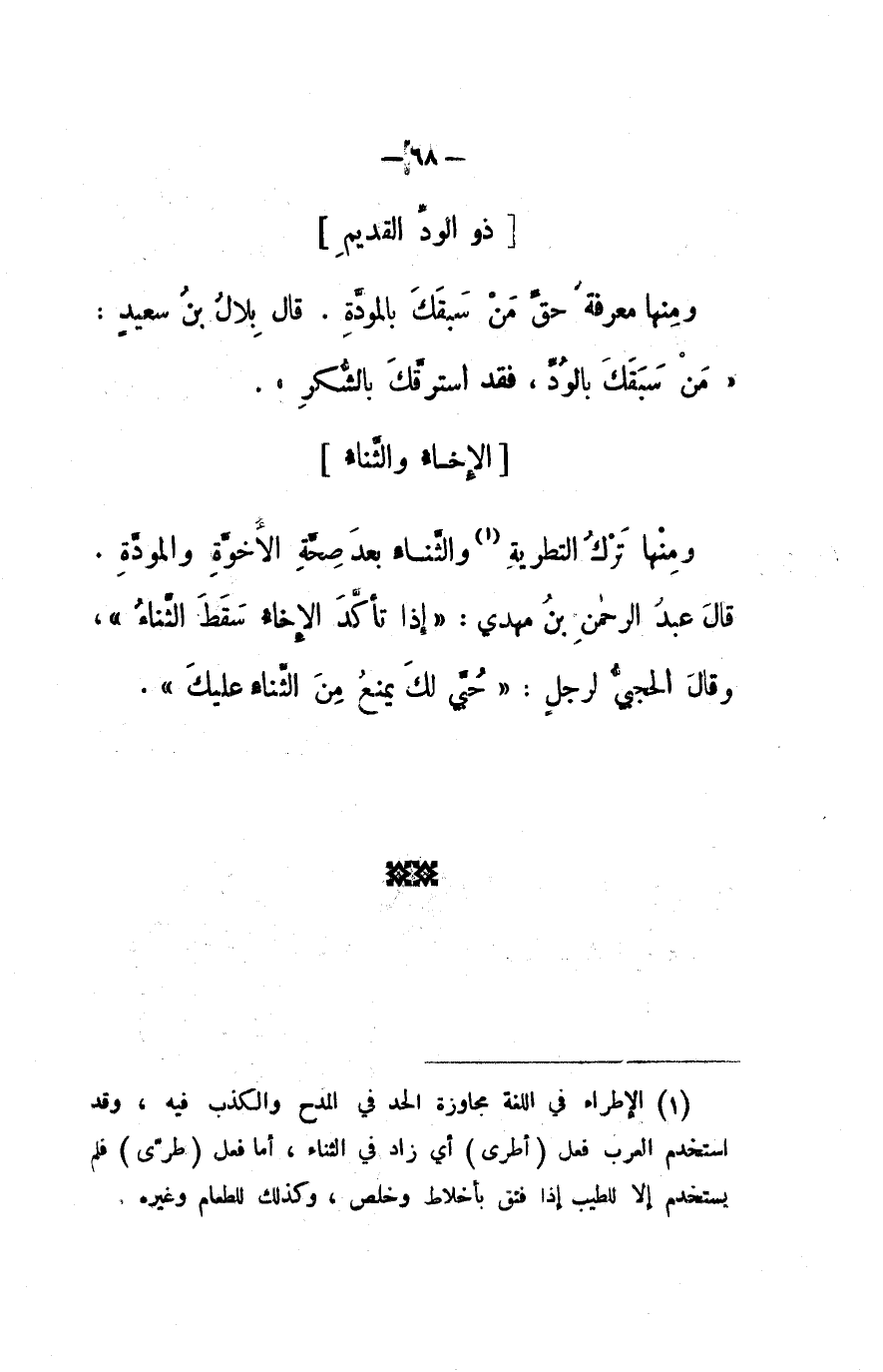 ومنها ترك التطرية والثناء بعد صحبة الأخوة والمودة. قال عبد الرحمن بن مهدي: (إذا تأكد الإخاء سقط الثناء) ، وقال الحجي لرجل: (حبي لك يمنع من الثناء عليك) .