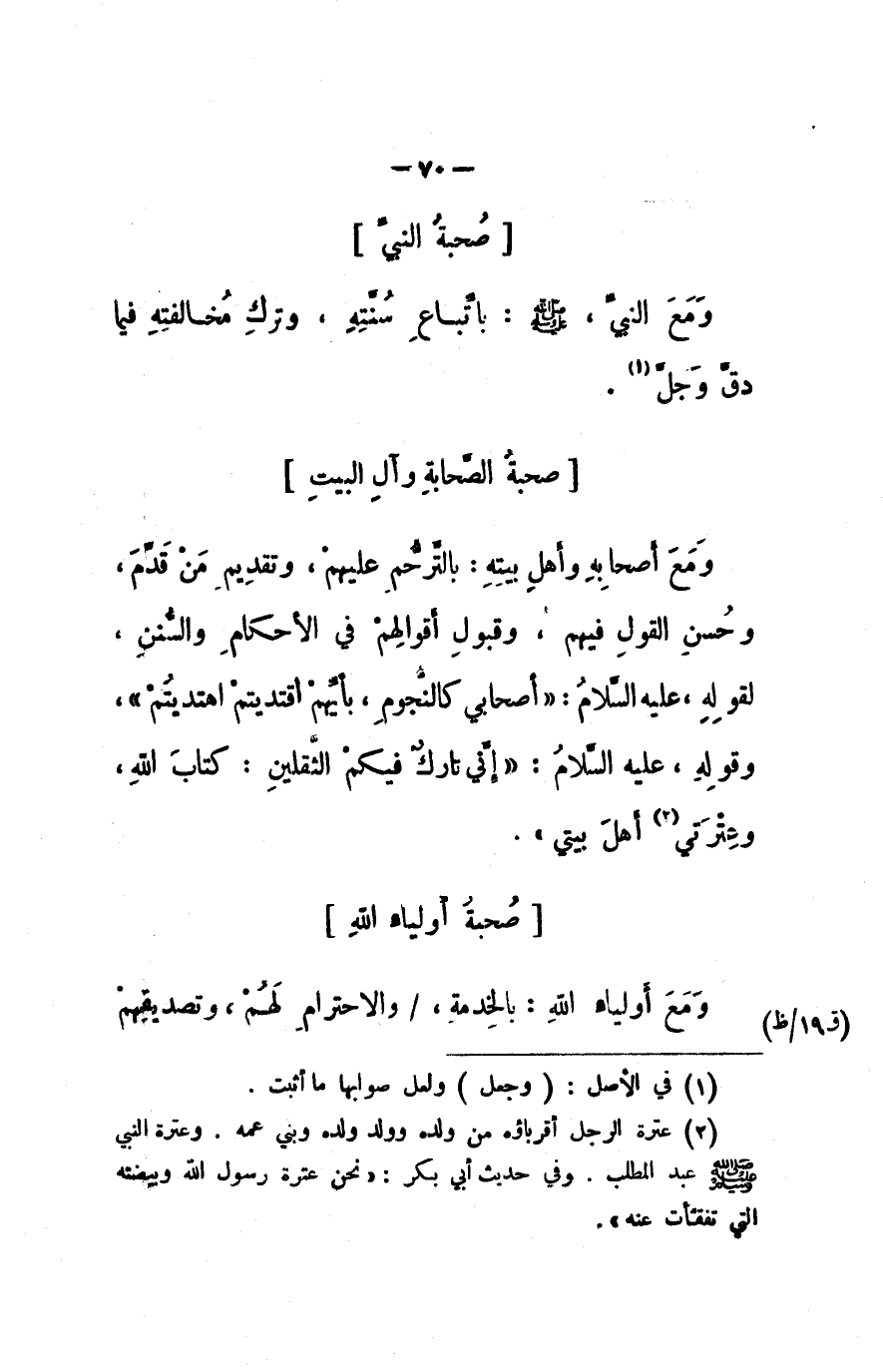 ومع أصحابه وأهل بيته: بالترحم عليهم، وتقديم من قدم، وحسن القول فيهم، وقبول أقوالهم في الأحكام والسنن، لقوله عليه السلام: (أصحابي كالنجوم، بأيهم اقتديتم اهتديتم) ، وقوله عليه السلام: (إني تارك فيكم الثقلين: كتاب الله، وعترتي أهل بيتي) .