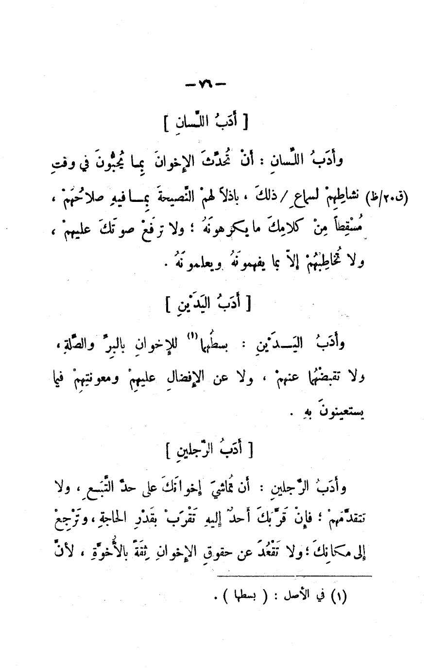 وأدب الرجلين: أن تماشي إخوانك على حد التبع، ولا تتقدمهم؛ فإن قربك إليه تقرب بقدر الحاجة، وترجع إلى مكانك؛ ولا تقعد عن حقوق الإخوان ثقة بالأخوة، لأن
