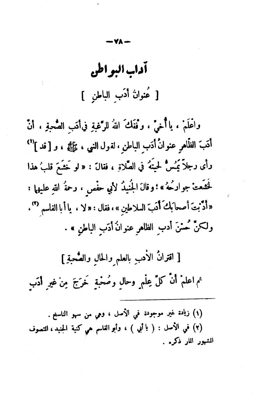 واعلم، يا أخي، وفقك الله للرغبة في أدب الصحبة، أن أدب الظاهر عنوان أدب الباطن، لقول النبي صلى الله عليه وسلم وقد رأى رجلاً يمس لحيته في الصلاة، فقال: (لو خشع قلب هذا لخشعت جوارحه) ؛ وقال الجنيد لأبي حفص، رحمة الله عليهما: (أدبت أصحابك أدب السلاطين) ، فقال: (لا، يا أبا القاسم، ولكن حسن أدب الظاهر عنوان أدب الباطن) .