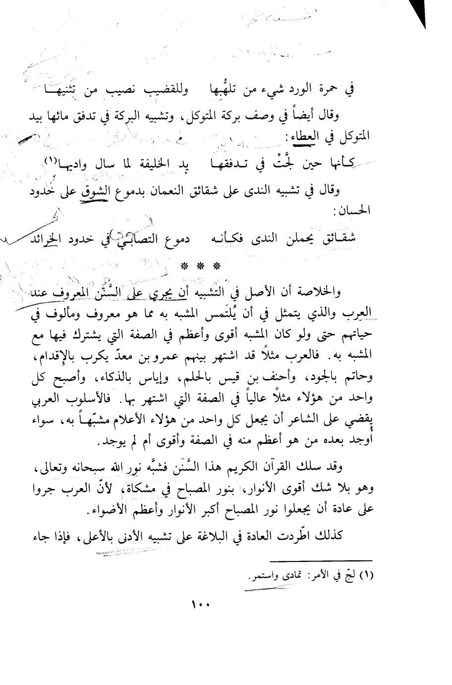 وإياس بالذكاء، وأصبح كل واحد من هؤلاء مثلا عاليا في الصفة التي اشتهر بها. فالأسلوب العربي يقضي على الشاعر أن يجعل كل واحد من هؤلاء الأعلام مشبّها به، سواء أوجد بعده من هو أعظم منه في الصفة وأقوى أم لم يوجد.