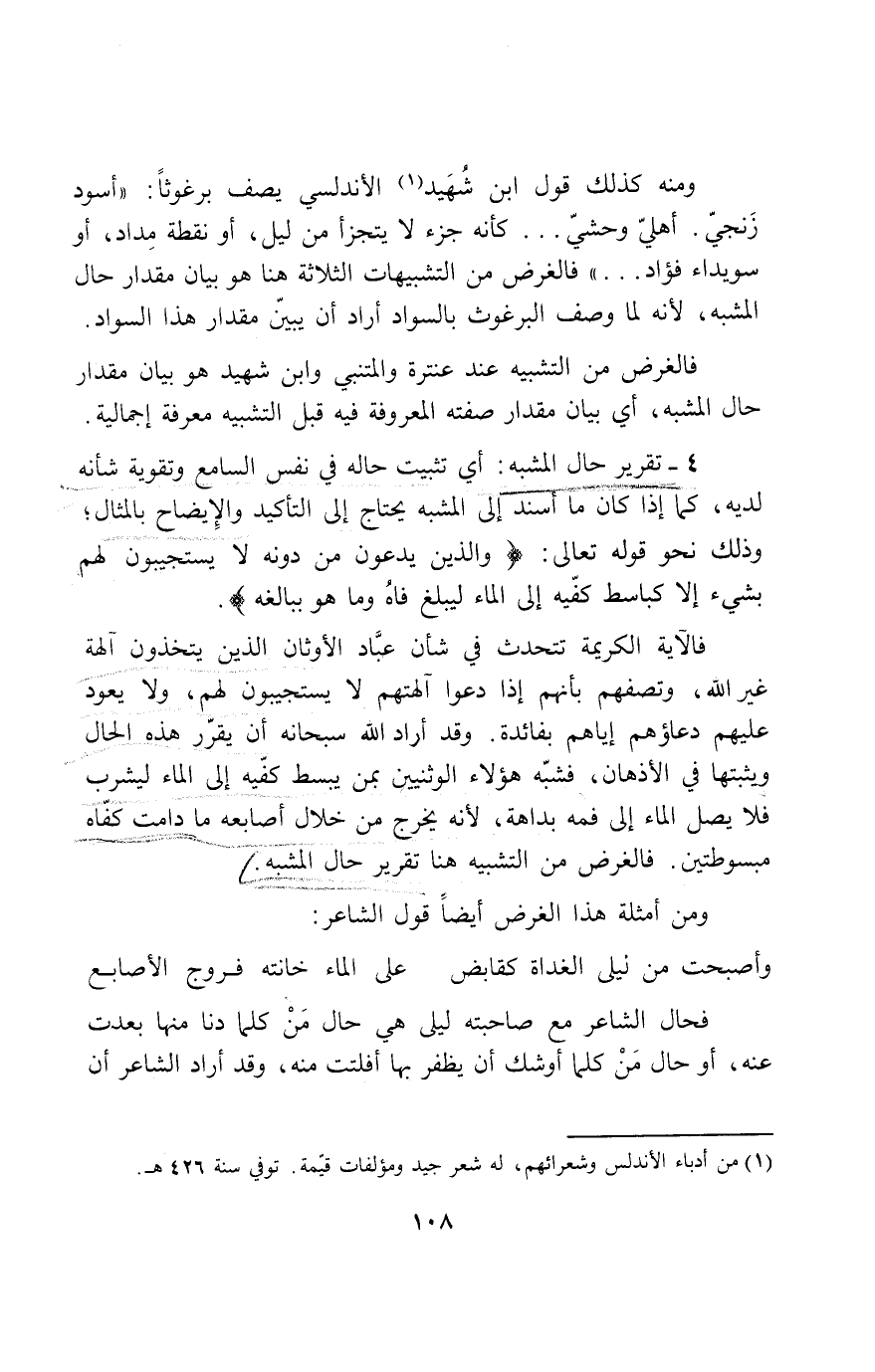ومنه كذلك قول ابن شهيد (¬1) الأندلسي يصف برغوثا: «أسود زنجيّ. أهليّ وحشيّ ... كأنه جزء لا يتجزأ من ليل، أو نقطة مداد، أو سويداء فؤاد ...» فالغرض من التشبيهات الثلاثة هنا هو بيان مقدار حال المشبه، لأنه لما وصف البرغوث بالسواد أراد أن يبيّن مقدار هذا السواد.