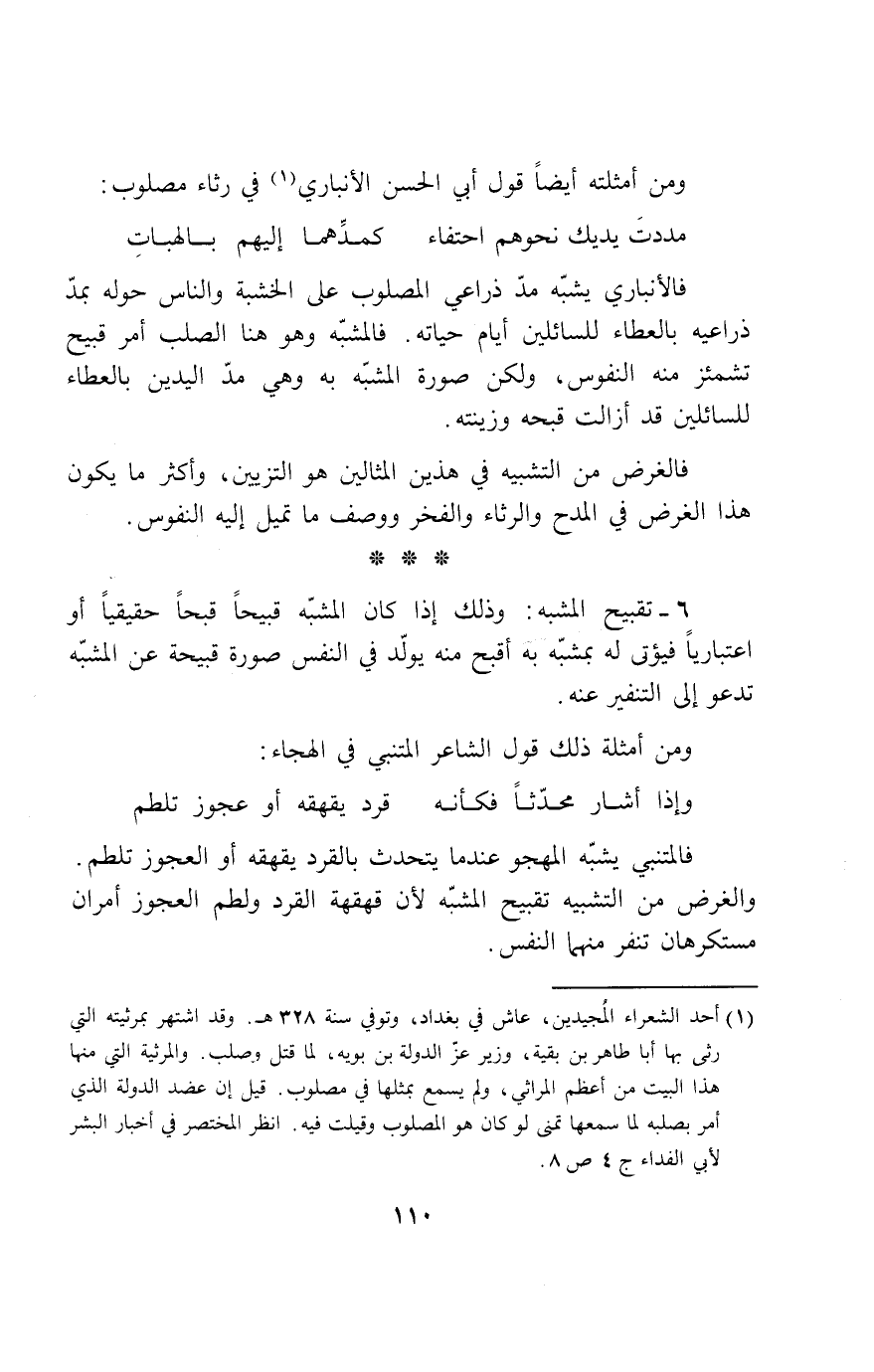 فالأنباري يشبّه مدّ ذراعي المصلوب على الخشبة والناس حوله بمدّ ذراعيه بالعطاء للسائلين أيام حياته. فالمشبّه وهو هنا الصلب أمر قبيح تشمئز منه النفوس، ولكن صورة المشبّه به وهي مدّ اليدين بالعطاء للسائلين قد أزالت قبحه وزينته.