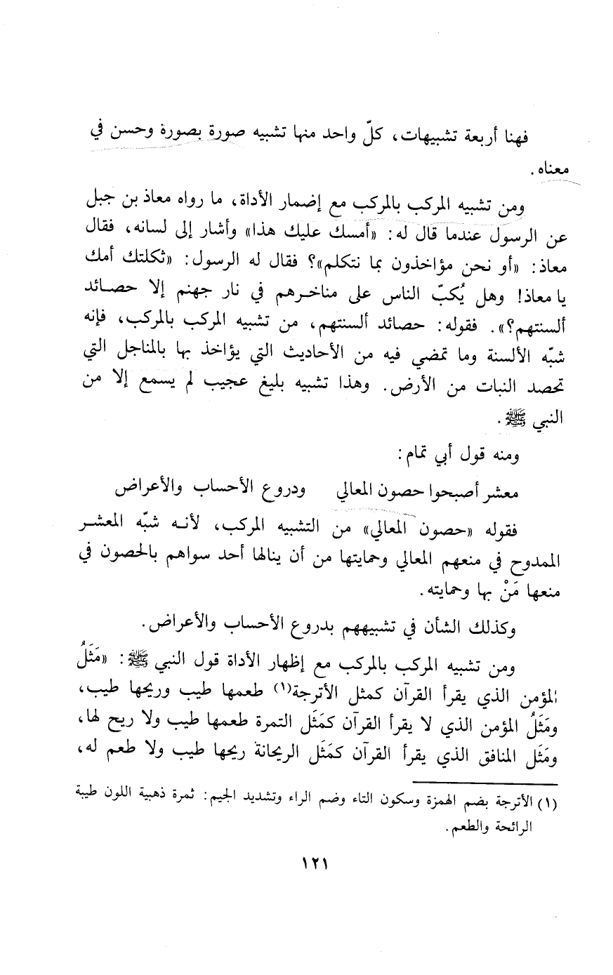 ومن تشبيه المركب بالمركب مع إضمار الأداة، ما رواه معاذ بن جبل عن الرسول عند ما قال له: «أمسك عليك هذا» وأشار إلى لسانه، فقال معاذ: «أو نحن مؤاخذون بما نتكلم»؟ فقال له الرسول: «ثكلتك أمك يا معاذ! وهل يكبّ الناس على مناخرهم في نار جهنم إلا حصائد ألسنتهم؟». فقوله: حصائد ألسنتهم، من تشبيه المركب بالمركب، فإنه شبّه الألسنة وما تمضي فيه من الأحاديث التي يؤاخذ بها بالمناجل التي تحصد النبات من الأرض. وهذا تشبيه بليغ عجيب لم يسمع إلا من النبي صلّى الله عليه وسلّم.
