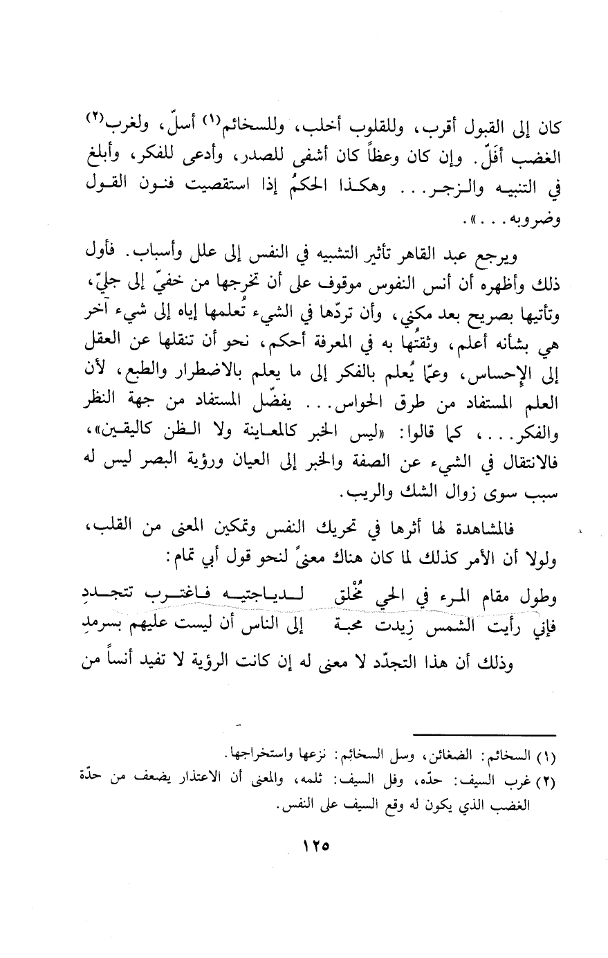 ويرجع عبد القاهر تأثير التشبيه في النفس إلى علل وأسباب. فأول ذلك وأظهره أن أنس النفوس موقوف على أن تخرجها من خفيّ إلى جليّ، وتأتيها بصريح بعد مكني، وأن تردّها في الشيء تعلمها إياه إلى شيء آخر هي بشأنه أعلم، وثقتها به في المعرفة أحكم، نحو أن تنقلها عن العقل إلى الإحساس، وعمّا يعلم بالفكر إلى ما يعلم بالاضطرار والطبع، لأن العلم المستفاد من طرق الحواس ... يفضّل المستفاد من جهة النظر والفكر ... ، كما قالوا: «ليس الخبر كالمعاينة ولا الظن كاليقين»، فالانتقال في الشيء عن الصفة والخبر إلى العيان ورؤية البصر ليس له سبب سوى زوال الشك والريب.
