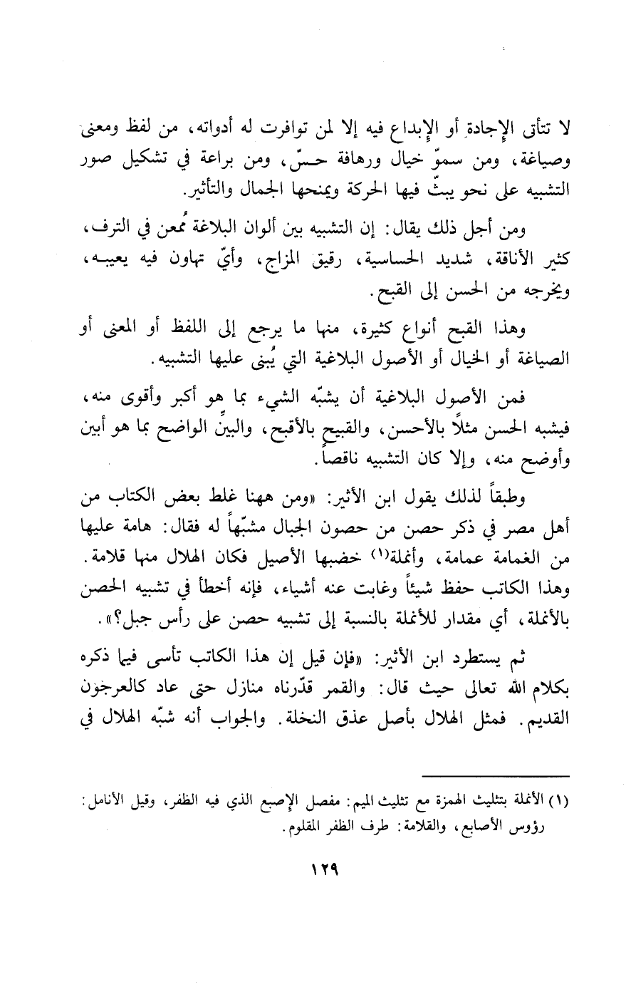 وطبقا لذلك يقول ابن الأثير: «ومن ههنا غلط بعض الكتاب من أهل مصر في ذكر حصن من حصون الجبال مشبّها له فقال: هامة عليها من الغمامة عمامة، وأنملة (¬1) خضبها الأصيل فكان الهلال منها قلامة.