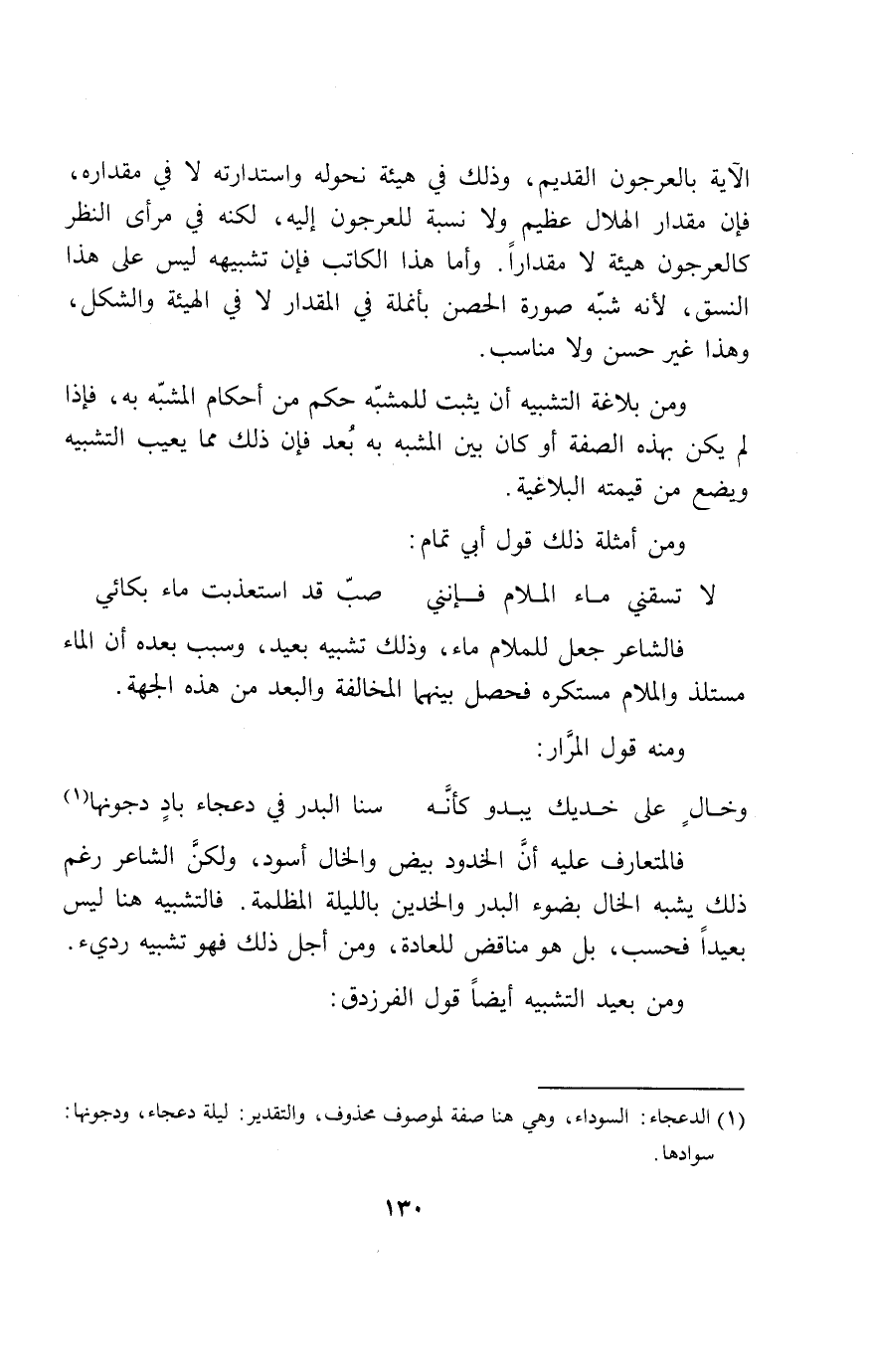 الآية بالعرجون القديم، وذلك في هيئة نحوله واستدارته لا في مقداره، فإن مقدار الهلال عظيم ولا نسبة للعرجون إليه، لكنه في مرأى النظر كالعرجون هيئة لا مقدارا. وأما هذا الكاتب فإن تشبيهه ليس على هذا النسق، لأنه شبّه صورة الحصن بأنملة في المقدار لا في الهيئة والشكل، وهذا غير حسن ولا مناسب.