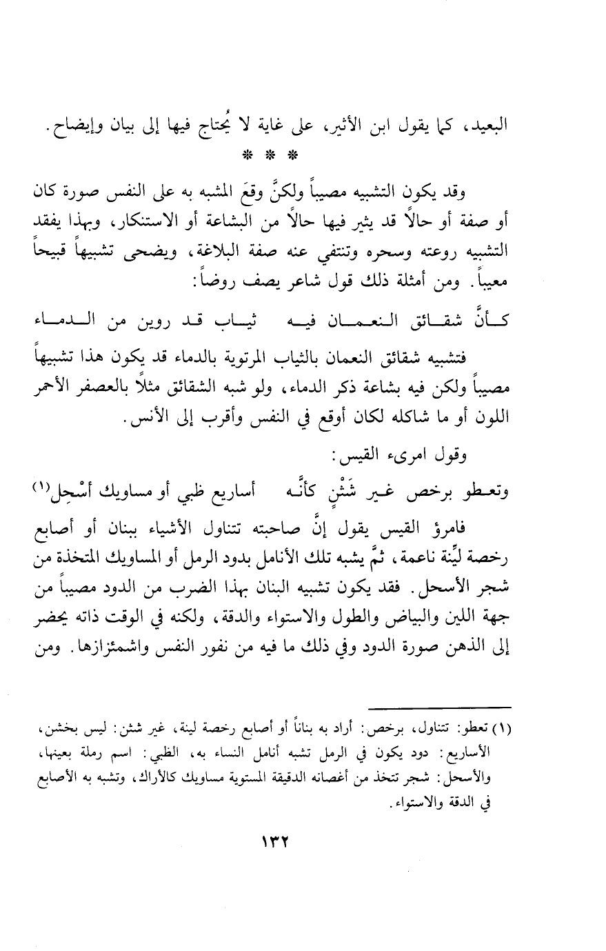 فامرؤ القيس يقول إنّ صاحبته تتناول الأشياء ببنان أو أصابع رخصة ليّنة ناعمة، ثمّ يشبه تلك الأنامل بدود الرمل أو المساويك المتخذة من شجر الأسحل. فقد يكون تشبيه البنان بهذا الضرب من الدود مصيبا من جهة اللين والبياض والطول والاستواء والدقة، ولكنه في الوقت ذاته يحضر إلى الذهن صورة الدود وفي ذلك ما فيه من نفور النفس واشمئزازها. ومن