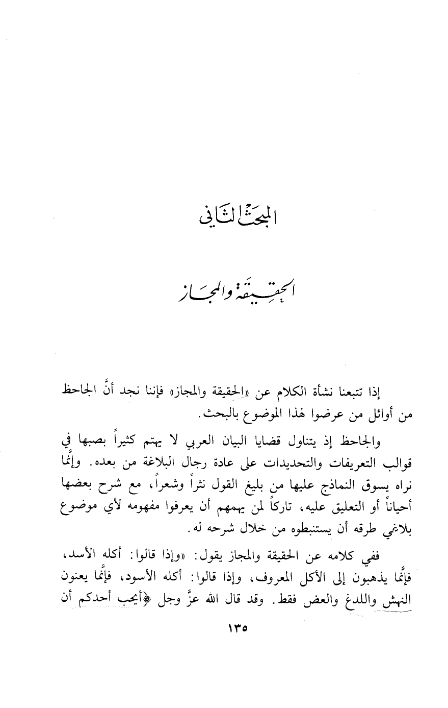 ففي كلامه عن الحقيقة والمجاز يقول: «وإذا قالوا: أكله الأسد، فإنّما يذهبون إلى الأكل المعروف، وإذا قالوا: أكله الأسود، فإنّما يعنون النهش واللدغ والعض فقط. وقد قال الله عزّ وجل أَيُحِبُّ أَحَدُكُمْ أَنْ