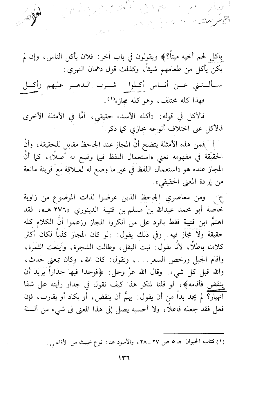 ومن معاصري الجاحظ الذين عرضوا لذات الموضوع من زاوية خاصة أبو محمد عبد الله بن مسلم بن قتيبة الدينوري «276 هـ»، فقد اهتمّ ابن قتيبة فقط بالرد على من أنكروا المجاز وزعموا أنّ الكلام كله حقيقة ولا مجاز فيه. وفي ذلك يقول: «لو كان المجاز كذبا لكان أكثر كلامنا باطلا، لأنّا نقول: نبت البقل، وطالت الشجرة، وأينعت الثمرة، وأقام الجبل ورخص السعر ... ، وتقول: كان الله، وكان بمعنى حدث، والله قبل كل شيء. وقال الله عزّ وجل: فَوَجَدا فِيها جِداراً يُرِيدُ أَنْ يَنْقَضَّ فَأَقامَهُ، لو قلنا لمنكر هذا كيف تقول في جدار رأيته على شفا انهيار؟ لم يجد بدا من أن يقول: يهمّ أن ينقض، أو يكاد أو يقارب، فإن فعل فقد جعله فاعلا، ولا أحسبه يصل إلى هذا المعنى في شيء من ألسنة