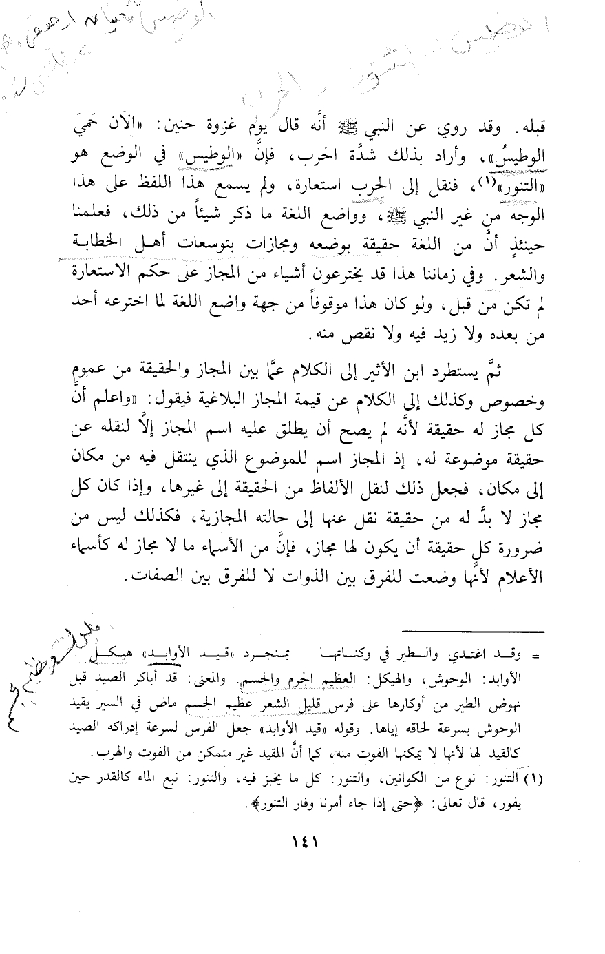 قبله. وقد روي عن النبي صلّى الله عليه وسلّم أنّه قال يوم غزوة حنين: «الآن حمي الوطيس»، وأراد بذلك شدّة الحرب، فإنّ «الوطيس» في الوضع هو «التنور» (¬1)، فنقل إلى الحرب استعارة، ولم يسمع هذا اللفظ على هذا الوجه من غير النبي صلّى الله عليه وسلّم، وواضع اللغة ما ذكر شيئا من ذلك، فعلمنا حينئذ أنّ من اللغة حقيقة بوضعه ومجازات بتوسعات أهل الخطابة والشعر. وفي زماننا هذا قد يخترعون أشياء من المجاز على حكم الاستعارة لم تكن من قبل، ولو كان هذا موقوفا من جهة واضع اللغة لما اخترعه أحد من بعده ولا زيد فيه ولا نقص منه.