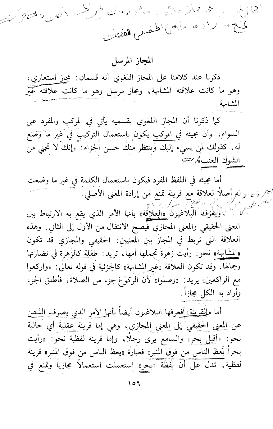 ويعرف البلاغيون «العلاقة» بأنها الأمر الذي يقع به الارتباط بين المعنى الحقيقي والمعنى المجازي فيصح الانتقال من الأول إلى الثاني. وهذه العلاقة التي تربط في المجاز بين المعنيين: الحقيقي والمجازي قد تكون «المشابهة» نحو: رأيت زهرة تحملها أمها، تريد: طفلة كالزهرة في نضارتها وجمالها. وقد تكون العلاقة «غير المشابهة» كالجزئية في قوله تعالى: «وَارْكَعُوا مَعَ الرَّاكِعِينَ» يريد: «وصلوا» لأن الركوع جزء من الصلاة، فأطلق الجزء وأراد به الكل مجازا.