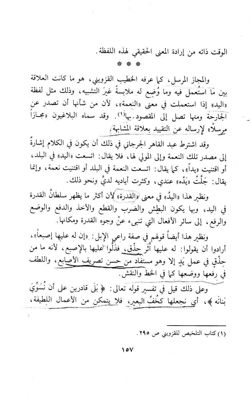 وقد اشترط عبد القاهر الجرجاني في ذلك أن يكون في الكلام إشارة إلى مصدر تلك النعمة وإلى المولي لها، فلا يقال: اتسعت «اليد» في البلد، أو اقتنيت «يدا»، كما يقال: اتسعت النعمة في البلد أو اقتنيت نعمة، وإنما يقال: جلّت «يده» عندي، وكثرت أياديه لديّ ونحو ذلك.