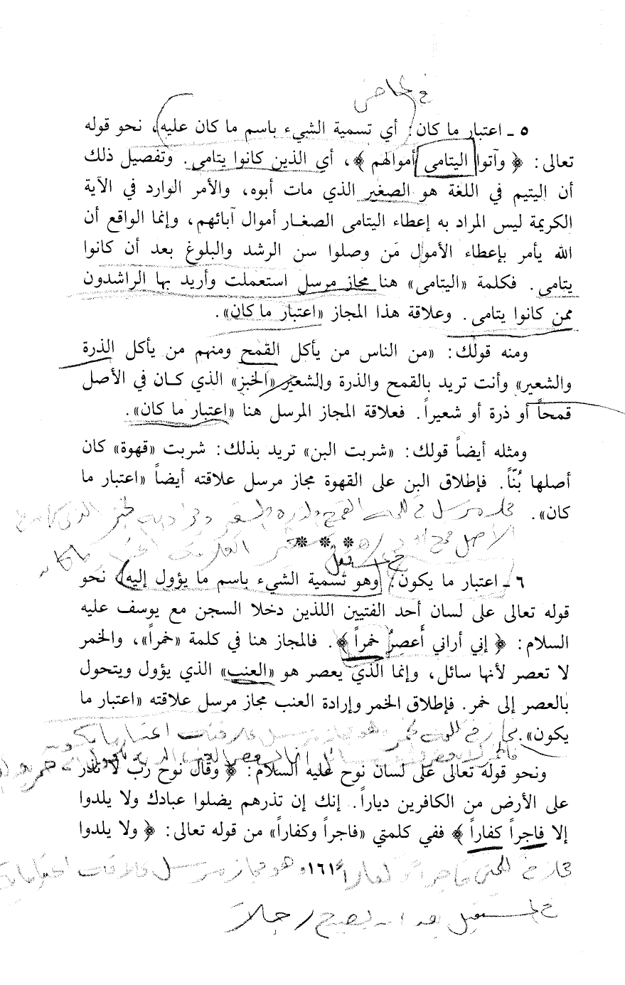 5 - اعتبار ما كان: أي تسمية الشيء باسم ما كان عليه، نحو قوله تعالى: وَآتُوا الْيَتامى أَمْوالَهُمْ، أي الذين كانوا يتامى. وتفصيل ذلك أن اليتيم في اللغة هو الصغير الذي مات أبوه، والأمر الوارد في الآية الكريمة ليس المراد به إعطاء اليتامى الصغار أموال آبائهم، وإنما الواقع أن الله يأمر بإعطاء الأمول من وصلوا سن الرشد والبلوغ بعد أن كانوا يتامى. فكلمة «اليتامى» هنا مجاز مرسل استعملت وأريد بها الراشدون ممن كانوا يتامى. وعلاقة هذا المجاز «اعتبار ما كان».