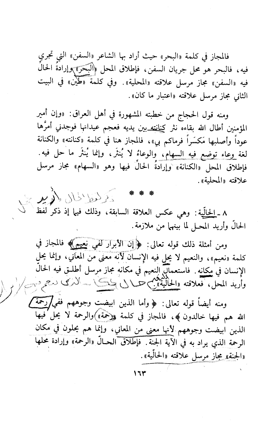 8 - الحالّية: وهي عكس العلاقة السابقة، وذلك فيما إذ ذكر لفظ الحالّ وأريد المحل لما بينهما من ملازمة.