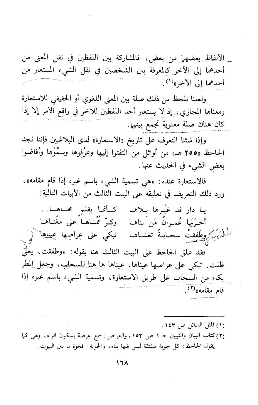 فقد علق الجاحظ على البيت الثالث هنا بقوله: «وطفقت، يعني ظلت. تبكي على عراصها عيناها، عيناها ها هنا للسحاب، وجعل المطر بكاء من السحاب على طريق الاستعارة، وتسمية الشيء باسم غيره إذا قام مقامه» (¬2).
