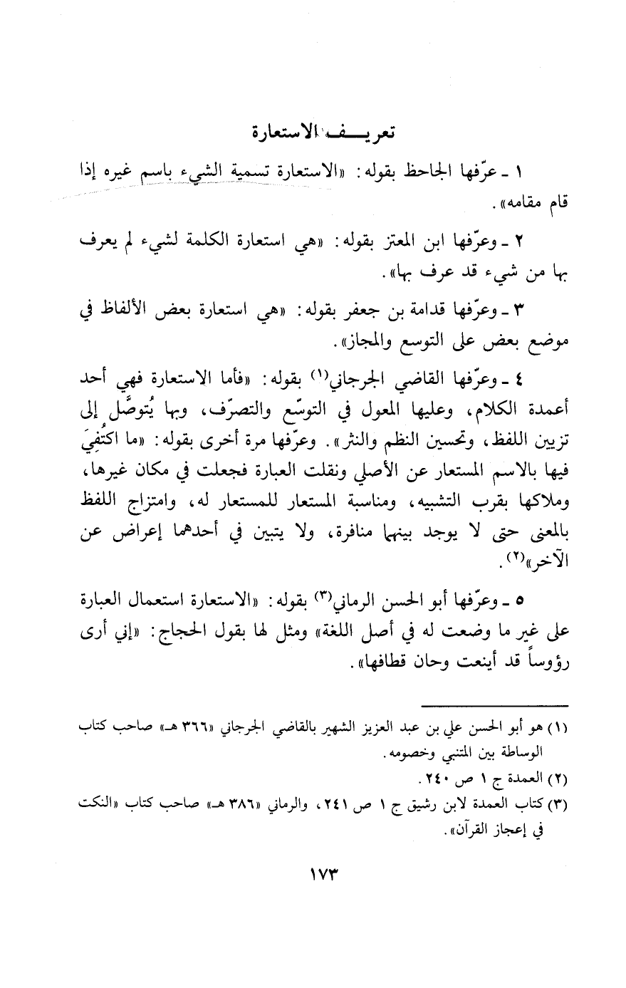(¬3) كتاب العمدة لابن رشيق ج 1 ص 241، والرماني «386 هـ» صاحب كتاب «النكت في إعجاز القرآن».