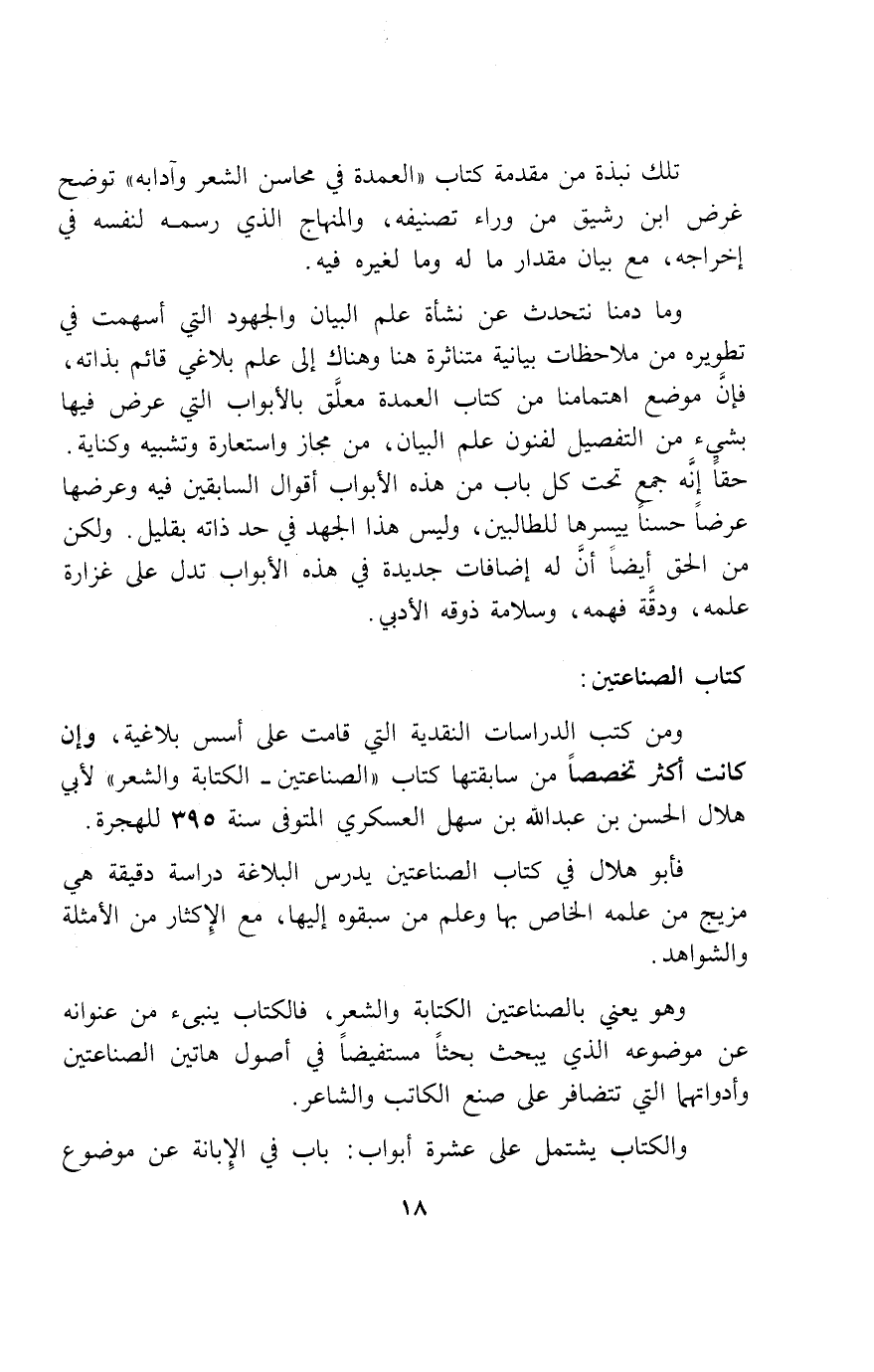 تلك نبذة من مقدمة كتاب «العمدة في محاسن الشعر وآدابه» توضح غرض ابن رشيق من وراء تصنيفه، والمنهاج الذي رسمه لنفسه في إخراجه، مع بيان مقدار ما له وما لغيره فيه.