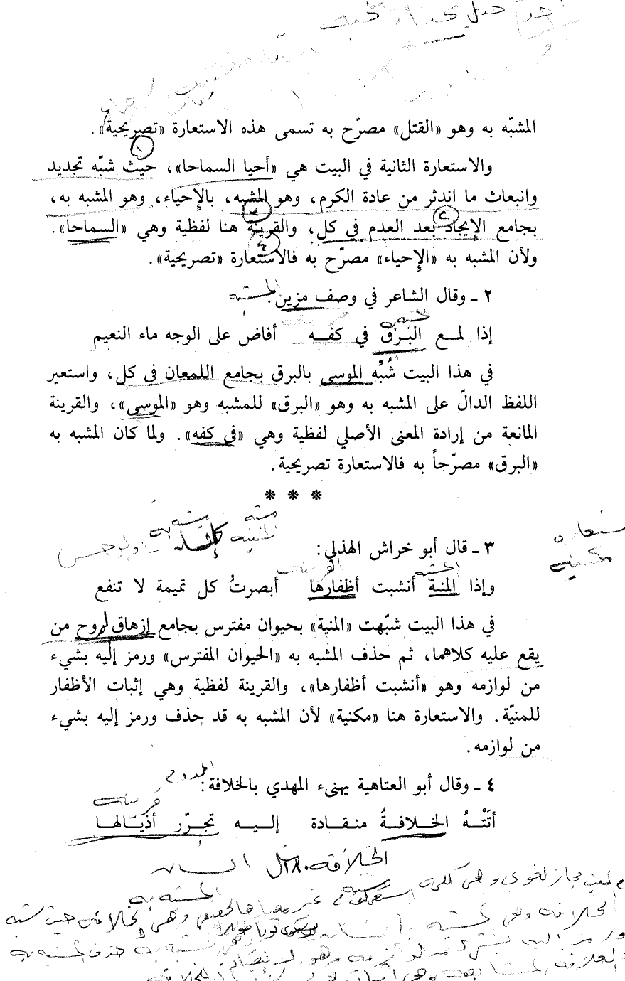 وهو «الموسى»، والقرينة المانعة من إرادة المعنى الأصلي لفظية وهي «في كفه». ولما كان المشبه به «البرق» مصرّحا به فالاستعارة تصريحية.