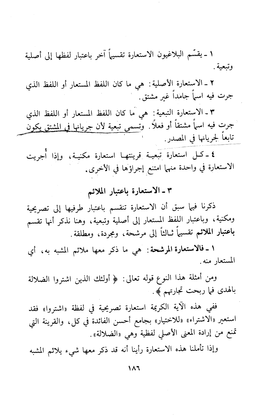 1 - يقسّم البلاغيون الاستعارة تقسيما آخر باعتبار لفظها إلى أصلية وتبعية.