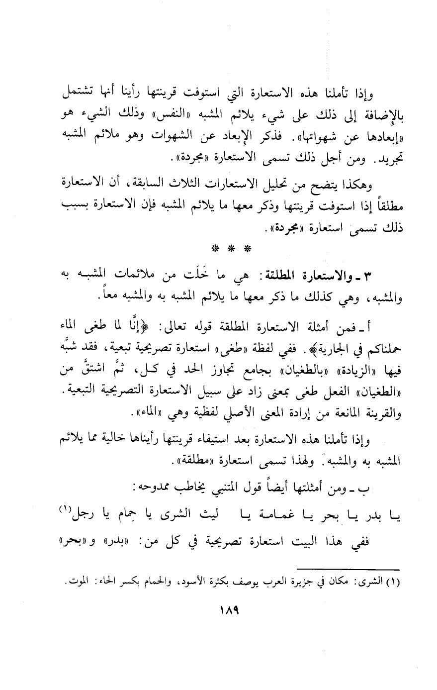وهكذا يتضح من تحليل الاستعارات الثلاث السابقة، أن الاستعارة مطلقا إذا استوفت قرينتها وذكر معها ما يلائم المشبه فإن الاستعارة بسبب ذلك تسمى استعارة «مجردة».