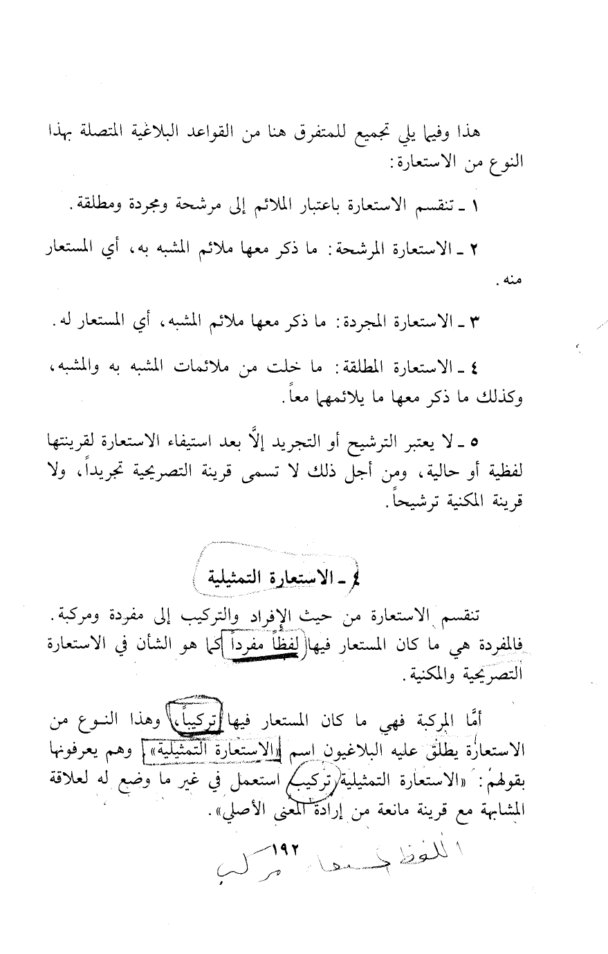 1 - تنقسم الاستعارة باعتبار الملائم إلى مرشحة ومجردة ومطلقة.