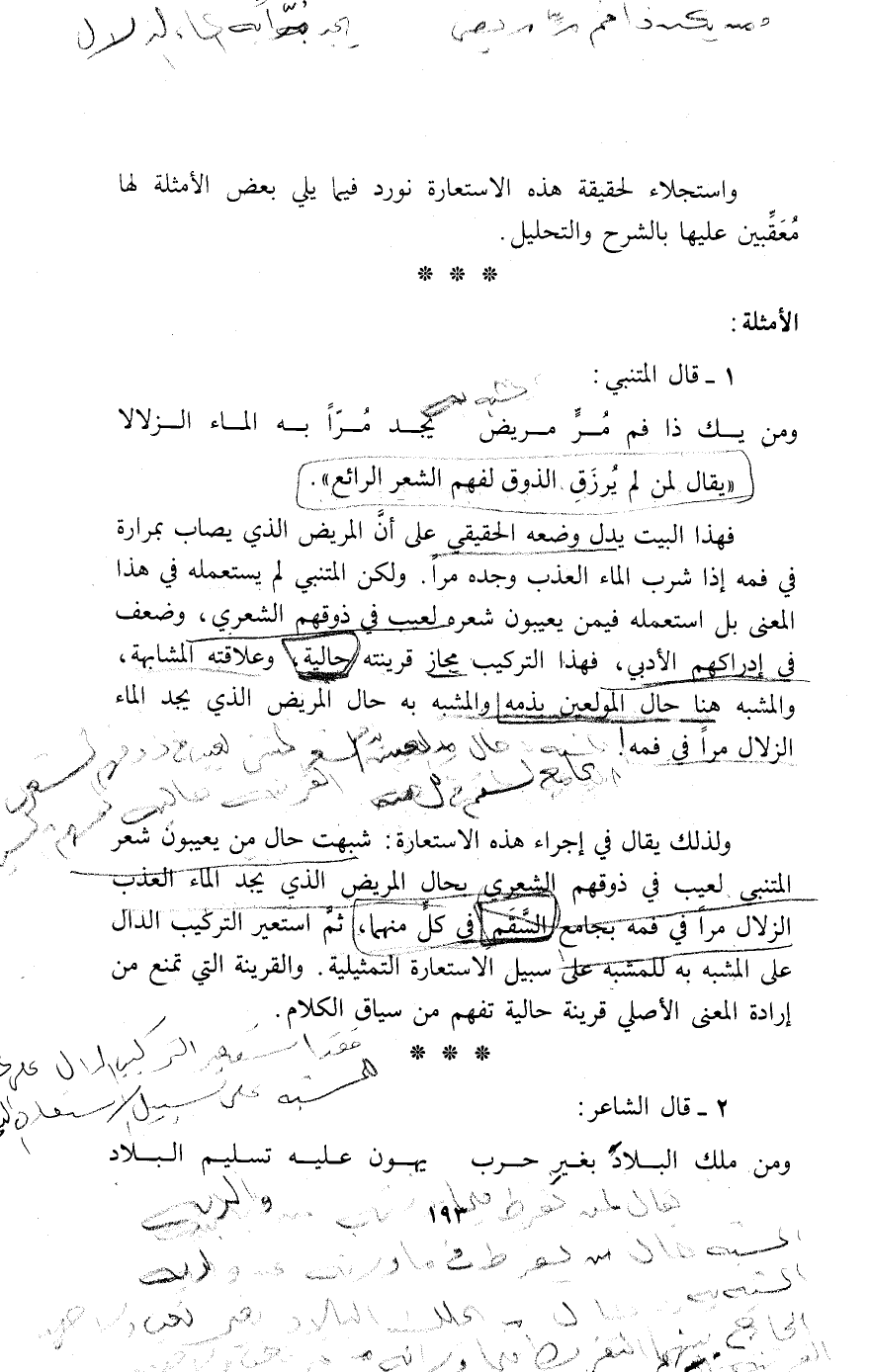 فهذا البيت يدل وضعه الحقيقي على أنّ المريض الذي يصاب بمرارة في فمه إذا شرب الماء العذب وجده مرا. ولكن المتنبي لم يستعمله في هذا المعنى بل استعمله فيمن يعيبون شعره لعيب في ذوقهم الشعري، وضعف في إدراكهم الأدبي، فهذا التركيب مجاز قرينته حالية، وعلاقته المشابهة، والمشبه هنا حال المولعين بذمه والمشبه به حال المريض الذي يجد الماء الزلال مرا في فمه.