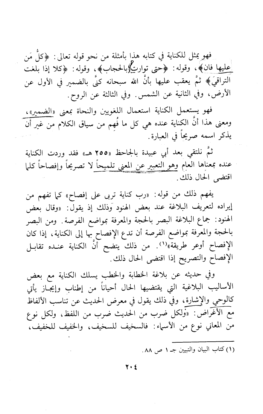 فهو يمثل للكناية في كتابه هذا بأمثلة من نحو قوله تعالى: كُلُّ مَنْ عَلَيْها فانٍ، وقوله: حَتَّى تَوارَتْ بِالْحِجابِ، وقوله: كَلَّا إِذا بَلَغَتِ التَّراقِيَ ثمّ يعقب عليها بأنّ الله سبحانه كنّى بالضمير في الأول عن الأرض، وفي الثانية عن الشمس. وفي الثالثة عن الروح.