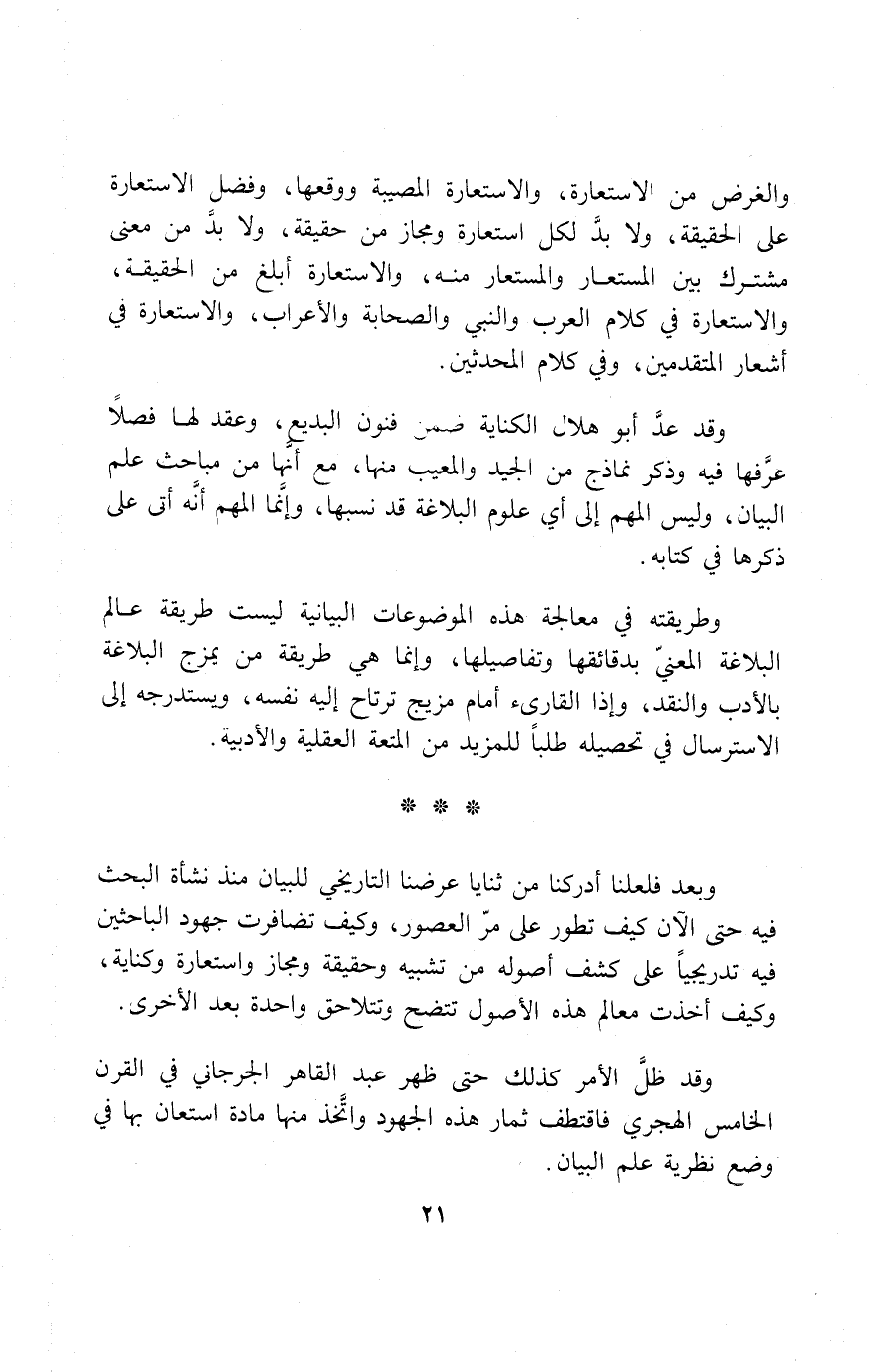 وبعد فلعلنا أدركنا من ثنايا عرضنا التاريخي للبيان منذ نشأة البحث فيه حتى الآن كيف تطور على مرّ العصور، وكيف تضافرت جهود الباحثين فيه تدريجيا على كشف أصوله من تشبيه وحقيقة ومجاز واستعارة وكناية، وكيف أخذت معالم هذه الأصول تتضح وتتلاحق واحدة بعد الأخرى.
