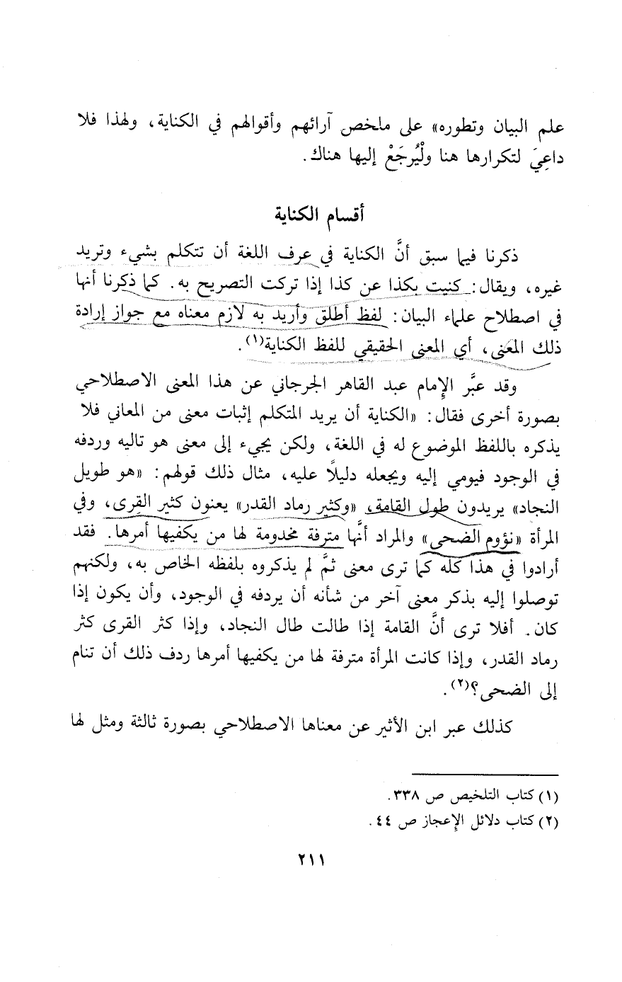 وقد عبّر الإمام عبد القاهر الجرجاني عن هذا المعنى الاصطلاحي بصورة أخرى فقال: «الكناية أن يريد المتكلم إثبات معنى من المعاني فلا يذكره باللفظ الموضوع له في اللغة، ولكن يجيء إلى معنى هو تاليه وردفه في الوجود فيومي إليه ويجعله دليلا عليه، مثال ذلك قولهم: «هو طويل النجاد» يريدون طول القامة، «وكثير رماد القدر» يعنون كثير القرى، وفي المرأة «نؤوم الضحى» والمراد أنّها مترفة مخدومة لها من يكفيها أمرها. فقد أرادوا في هذا كله كما ترى معنى ثمّ لم يذكروه بلفظه الخاص به، ولكنهم توصلوا إليه بذكر معنى آخر من شأنه أن يردفه في الوجود، وأن يكون إذا كان. أفلا ترى أنّ القامة إذا طالت طال النجاد، وإذا كثر القرى كثر رماد القدر، وإذا كانت المرأة مترفة لها من يكفيها أمرها ردف ذلك أن تنام إلى الضحى؟ (¬2).