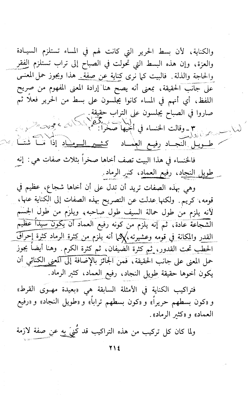 الصفات إلى الكناية عنها، لأنه يلزم من طول حمالة السيف طول صاحبه، ويلزم من طول الجسم الشجاعة عادة، ثم إنه يلزم من كونه رفيع العماد أن يكون سيدا عظيم القدر والمكانة في قومه وعشيرته، كما أنه يلزم من كثرة الرماد كثرة إحراق الحطب تحت القدور، ثم كثرة الضيفان، ثم كثرة الكرم. وهنا أيضا يجوز حمل المعنى على جانب الحقيقة، فمن الجائز بالإضافة إلى المعنى الكنائي أن يكون أخوها حقيقة طويل النجاد، رفيع العماد، كثير الرماد.