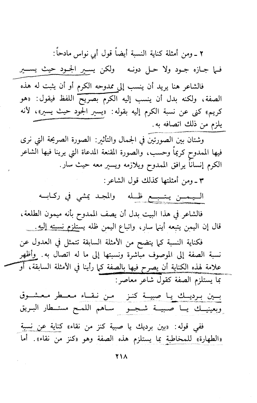 ففي قوله: «بين برديك يا صبية كنز من نقاء» كناية عن نسبة «الطهارة» للمخاطبة بما يستلزم هذه الصفة وهو «كنز من نقاء». أما