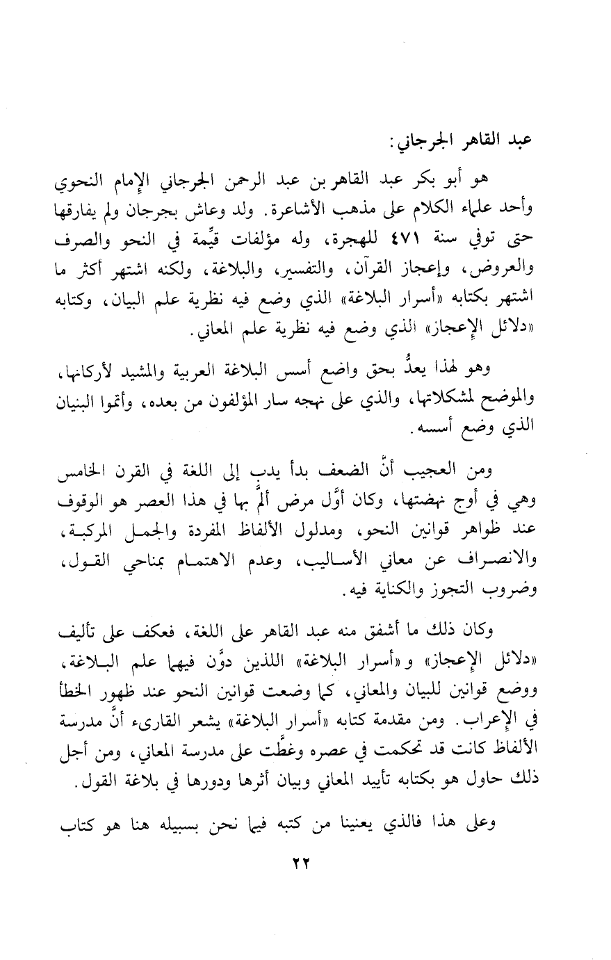 وهو لهذا يعدّ بحق واضع أسس البلاغة العربية والمشيد لأركانها، والموضح لمشكلاتها، والذي على نهجه سار المؤلفون من بعده، وأتموا البنيان الذي وضع أسسه.
