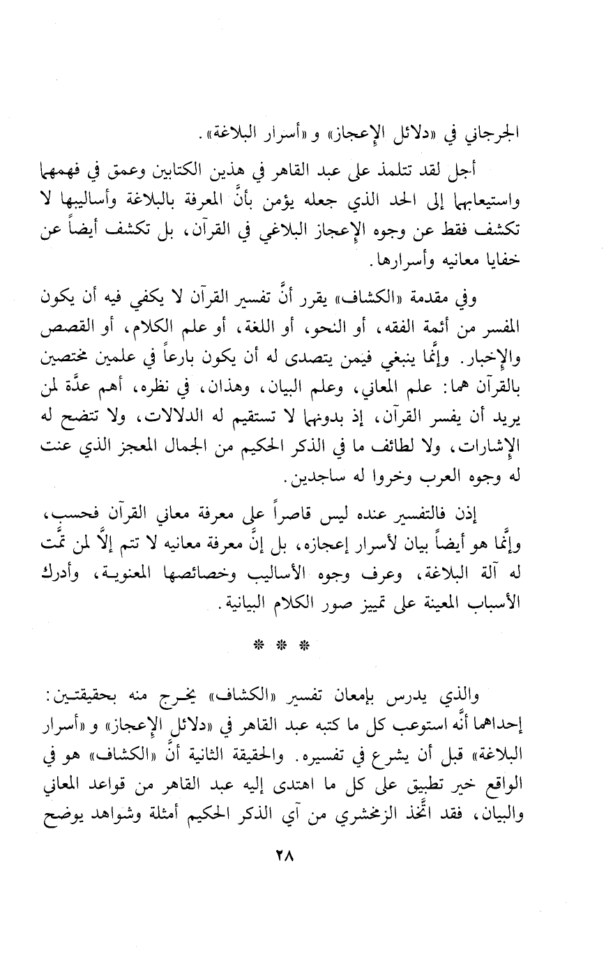 إحداهما أنّه استوعب كل ما كتبه عبد القاهر في «دلائل الإعجاز» و «أسرار البلاغة» قبل أن يشرع في تفسيره. والحقيقة الثانية أنّ «الكشاف» هو في الواقع خير تطبيق على كل ما اهتدى إليه عبد القاهر من قواعد المعاني والبيان، فقد اتّخذ الزمخشري من آي الذكر الحكيم أمثلة وشواهد يوضح