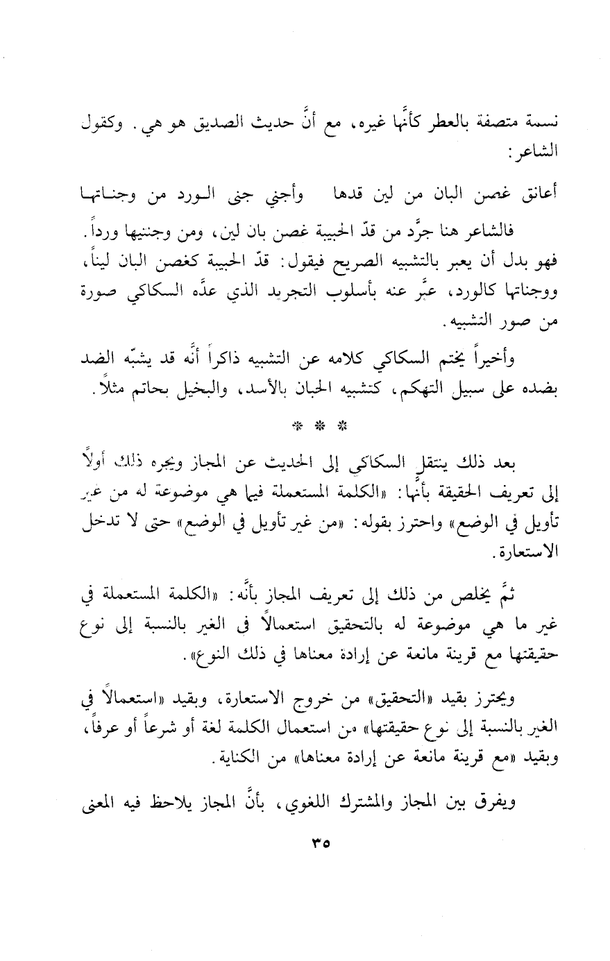بعد ذلك ينتقل السكاكي إلى الحديث عن المجاز ويجره ذلك أولا إلى تعريف الحقيقة بأنّها: «الكلمة المستعملة فيما هي موضوعة له من غير تأويل في الوضع» واحترز بقوله: «من غير تأويل في الوضع» حتى لا تدخل الاستعارة.