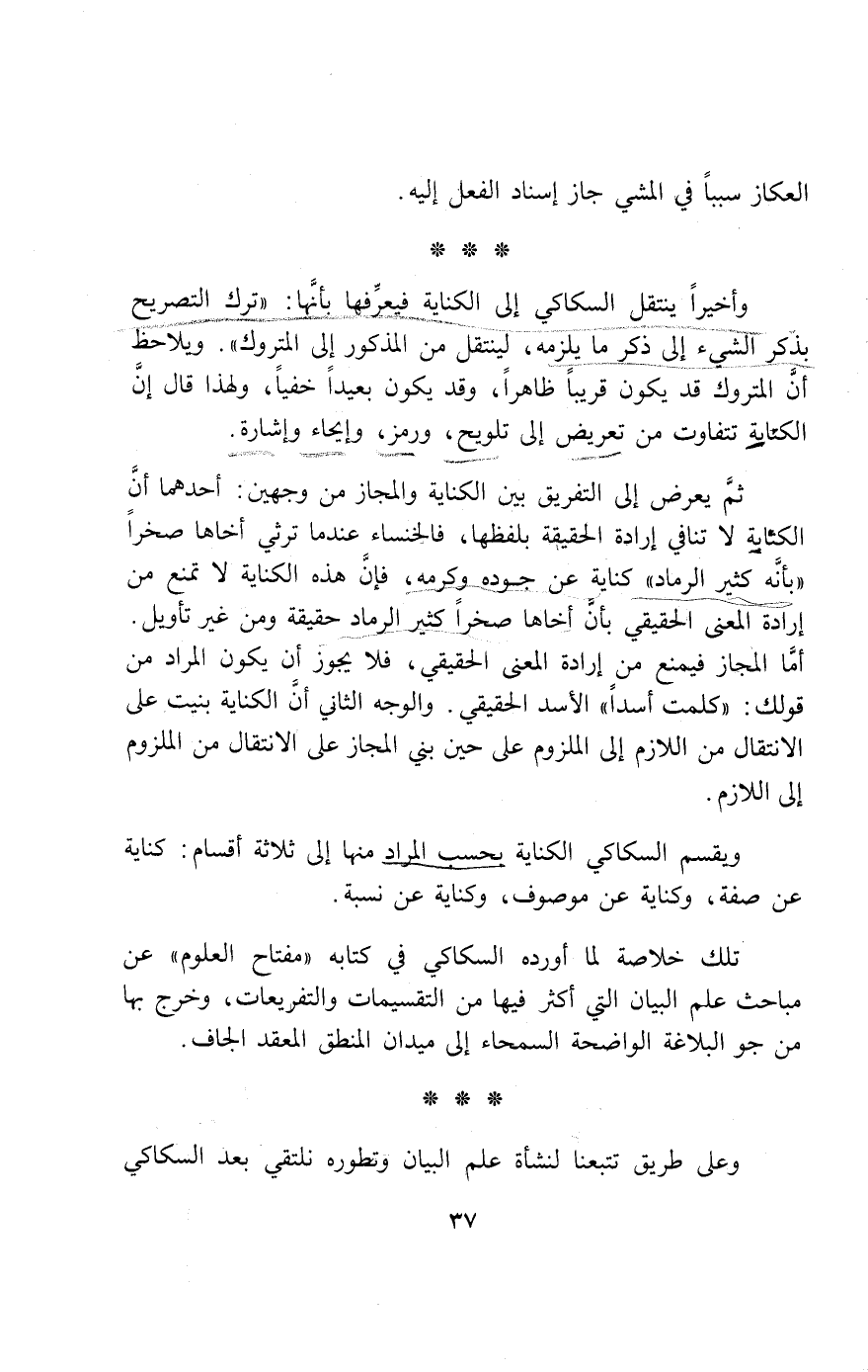 تلك خلاصة لما أورده السكاكي في كتابه «مفتاح العلوم» عن مباحث علم البيان التي أكثر فيها من التقسيمات والتفريعات، وخرج بها من جو البلاغة الواضحة السمحاء إلى ميدان المنطق المعقد الجاف.